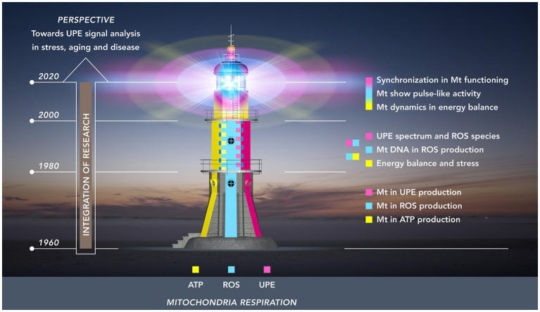 However, what is far lesser known is that mitochondria also release ultra-weak photon emissions (UPE), biophotons, between 300 and 900 nm (i.e., from UV to near-IR). These have been reported from all kinds of cells, small organisms, and even human skin.