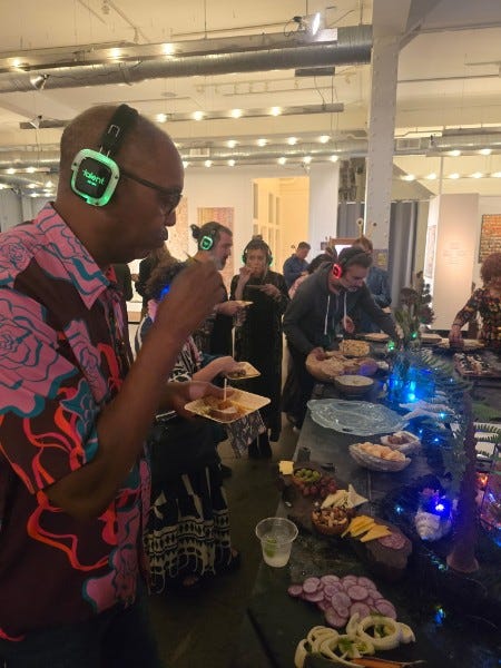 We played my soundscapes on silent disco headsets, while the guests ate the very food that they were listening to: ferns, seaweed, and mushrooms.